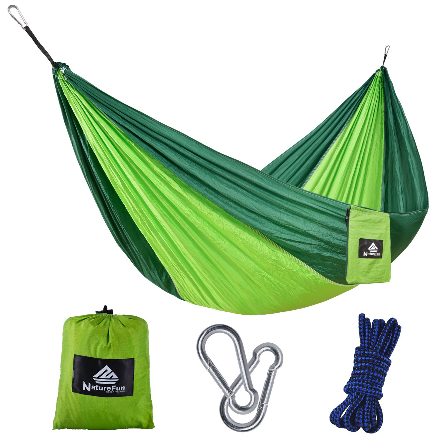 Zum Campen möchte man vielleicht auch gerne eine Hängematte mitnehmen, muss jedoch aufs Gewicht achten. Da eignen sich die besonders leichten Hängematte Modelle aus Fallschirm Stoff hervorragend. Gerade mal 450 g wiegt die tolle Outdoor Hängematte von NaturFun für derzeit 21,99 *€ und wird mit Karabinerhaken und dickem Seil geliefert.